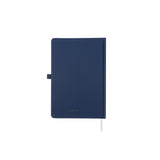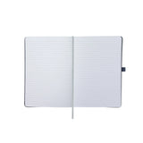 Padded, faux leather cover notebook with 100 sheets of lined paper and an attached pen loop. The complimentary colors and subtle silhouette design provide a balanced aesthetic, perfect for every day.